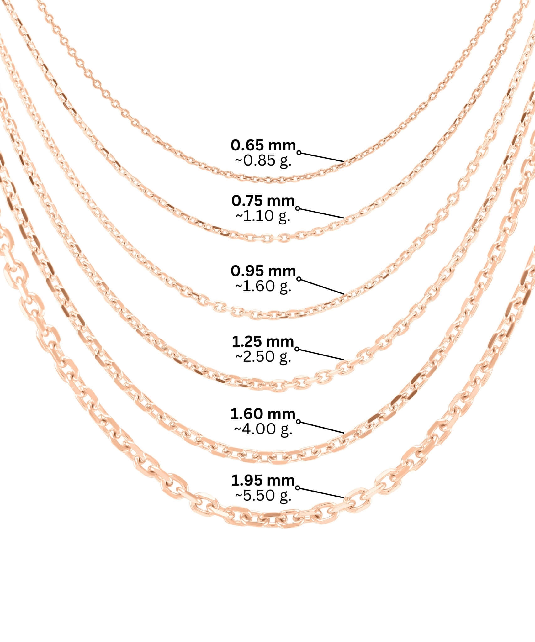 Dies ist eine einfache, aber elegante und zeitlose Goldkette. In diesem Geflecht ist die Anchor Goldkette besonders vielseitig, langlebig und hochwertig. Sie kann daher zu jedem Outfit und zu jeder Gelegenheit getragen werden. Rote und andere Goldketten können auch mit Goldanhängern oder anderen Goldschmuckstücken kombiniert werden. In unserem E-Shop finden Sie Rotgold, Gelbgold und Weißgold GoldkettenDie beliebteste Goldkettenflechtung weltweit ist die „Anker“-Flechtung. Wir bieten aber auch andere, anspruchsvollere oder interessantere Flechtungen an. Alle Goldketten in unserem Sortiment sind in verschiedenen Längen erhältlich: 42 cm, 45 cm, 50 cm, 55 cm, 60 cm oder in der verstellbaren Länge 42–45 cm. Darüber hinaus stehen verschiedene Kettenbreiten zur Auswahl: 0,65 mm, 0,75 mm, 0,95 mm, 1,25 mm, 1,60 mm und 1,95 mm.