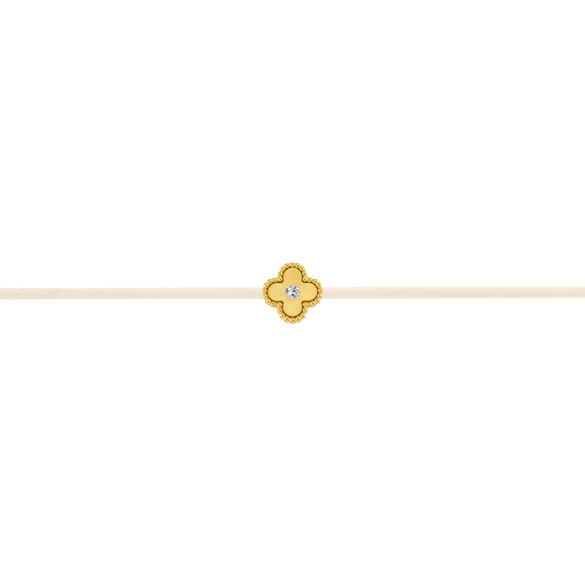 Subtle yet expressive, this white thread bracelet with clover and natural diamond symbolises luck, love and inner strength. It is made of high quality thread, natural diamond and 14k (585 fine) gold - a combination of these materials that ensures durability and impeccable aesthetics.