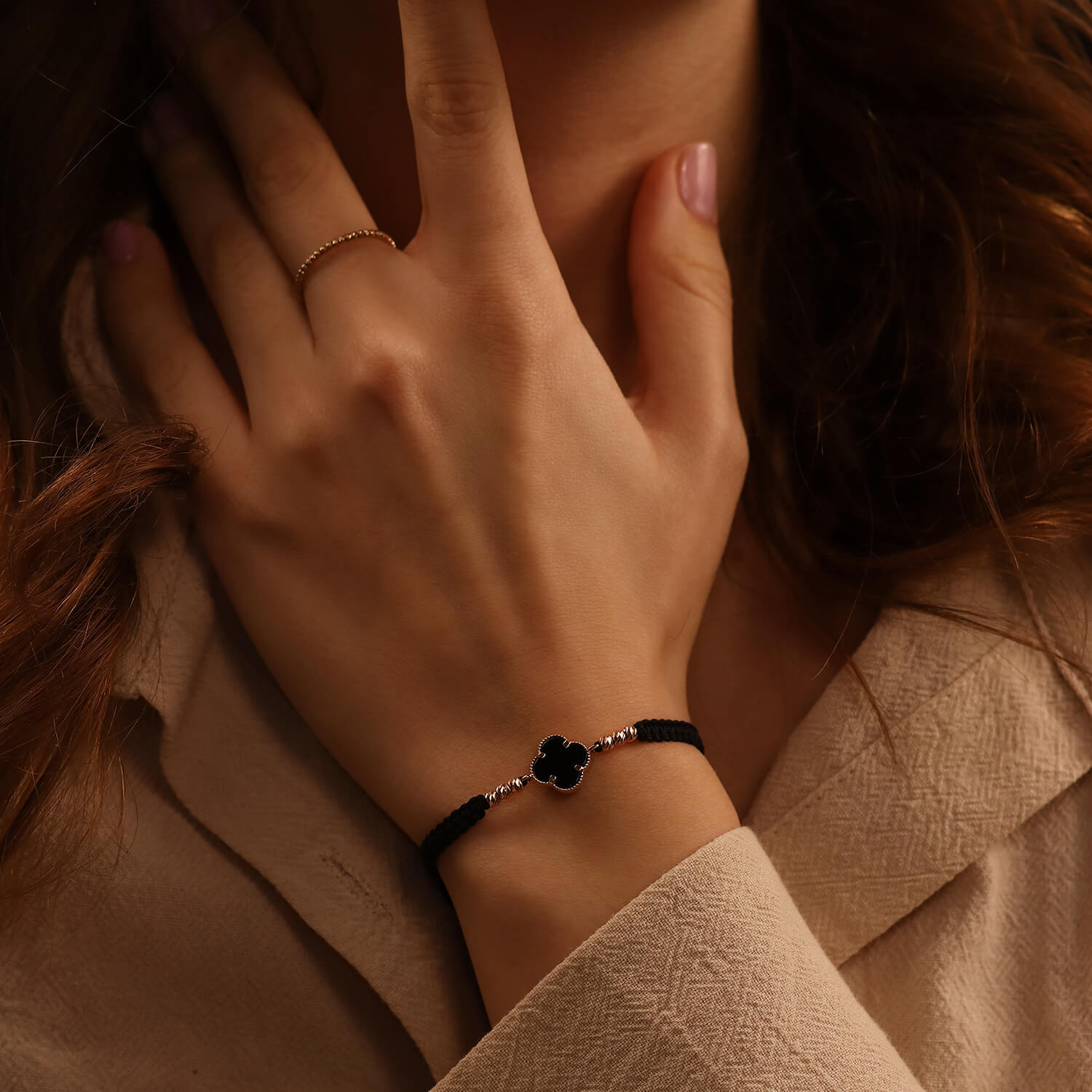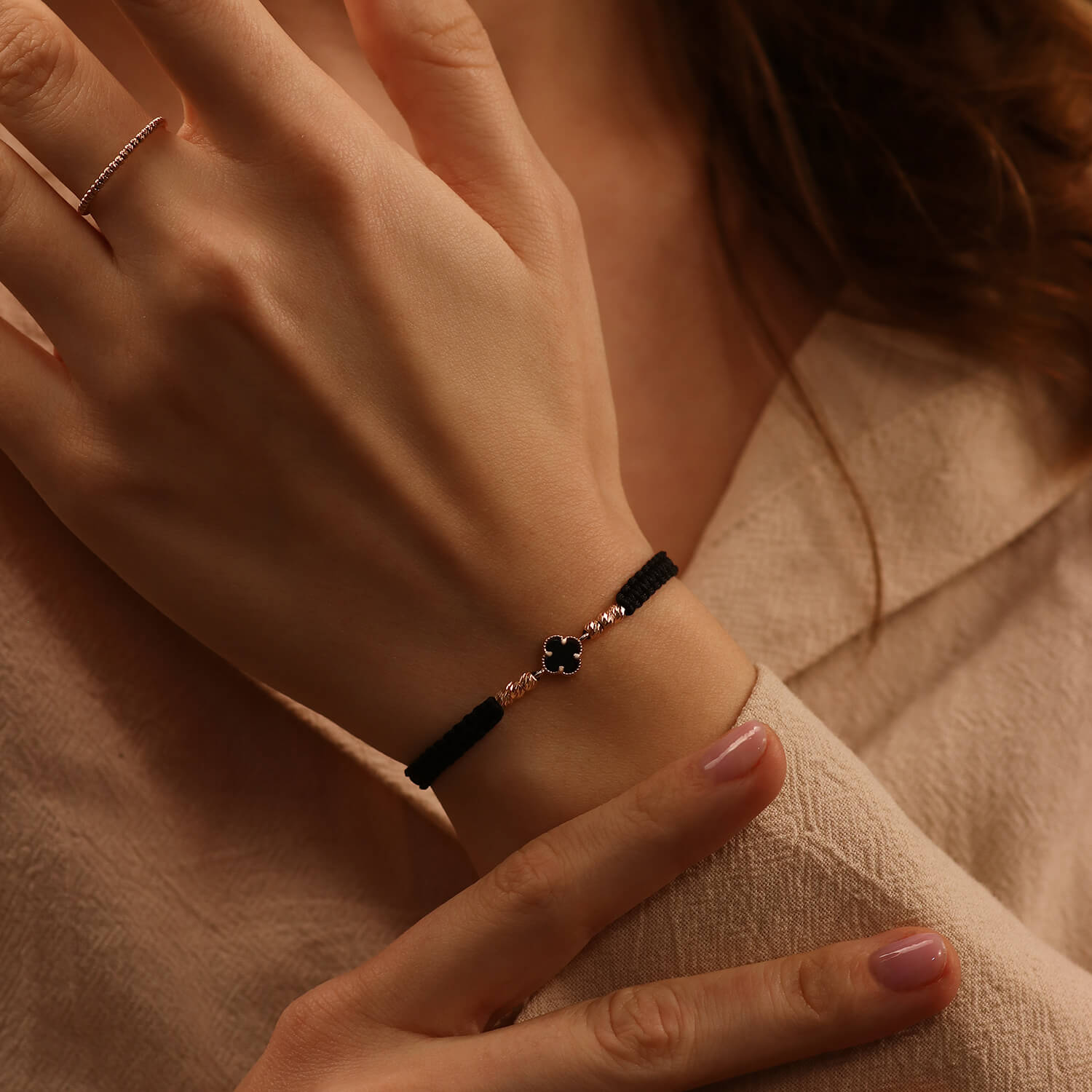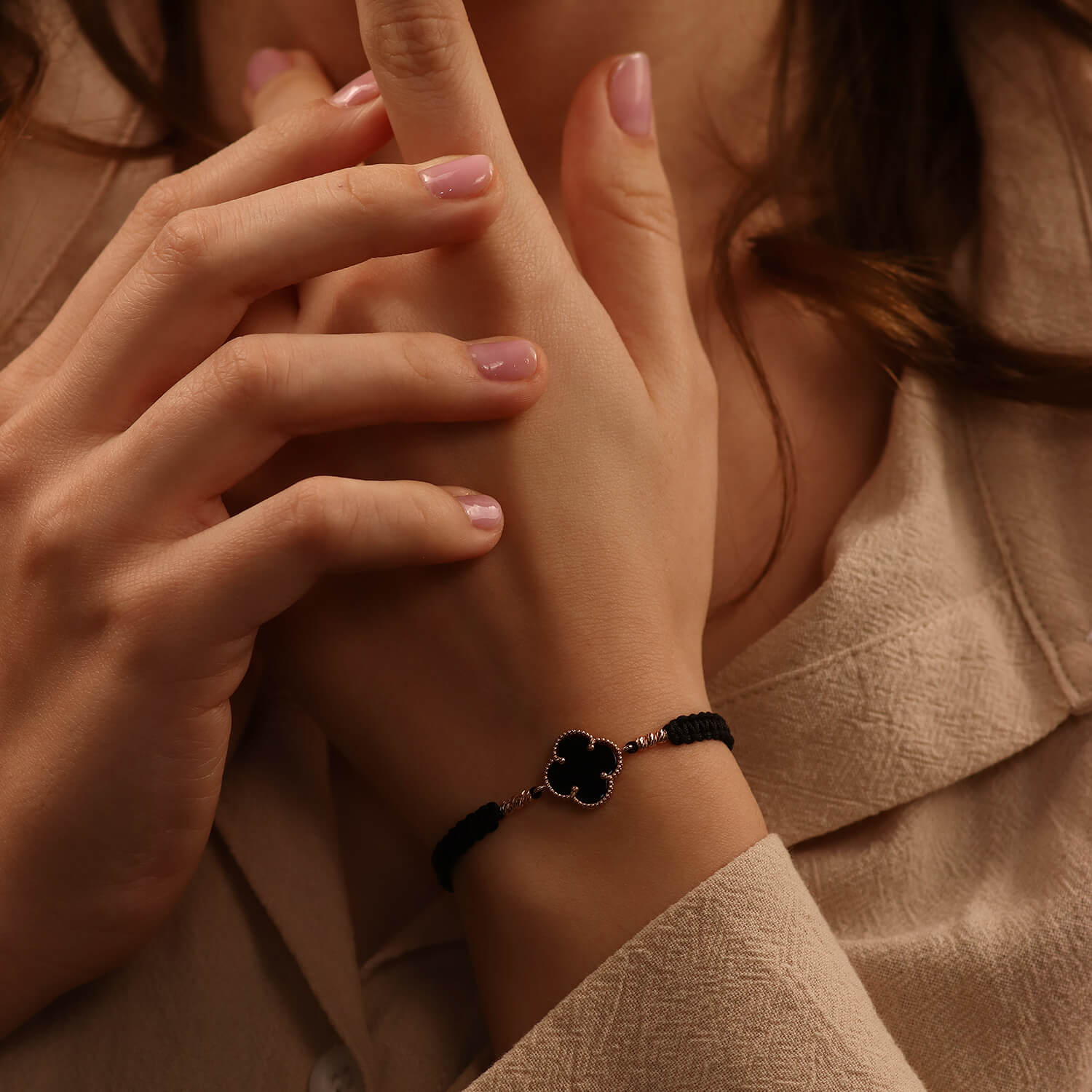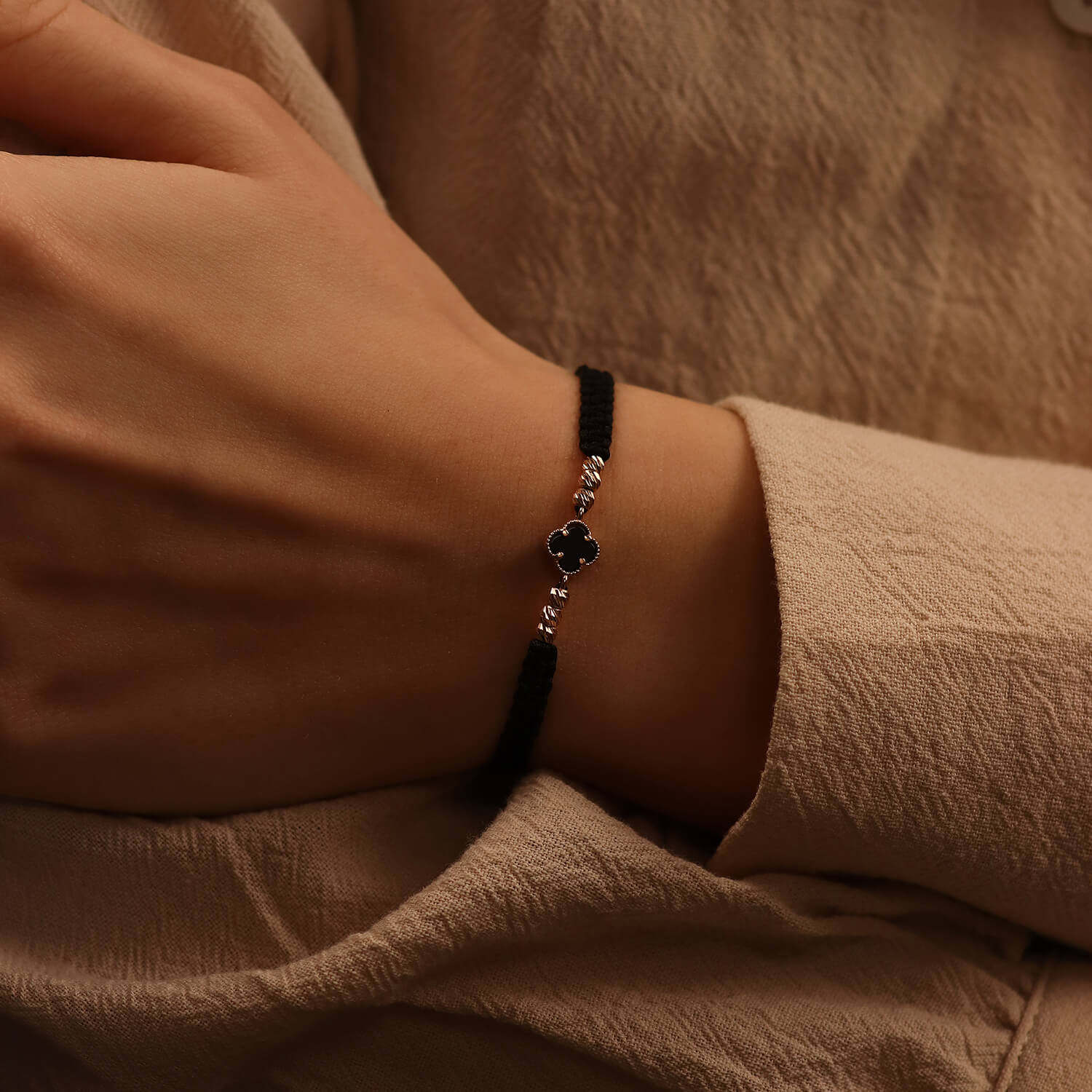 See elegantne ristikukujuline niidi käevõru on valmistatud ehtsast 585 kullast ja naturaalsest oonüksist. Just see niitkäevõru paistab silma oma õrna disaini ja luksuse poolest ning must oonüks lisab eksklusiivsust ja peenust.