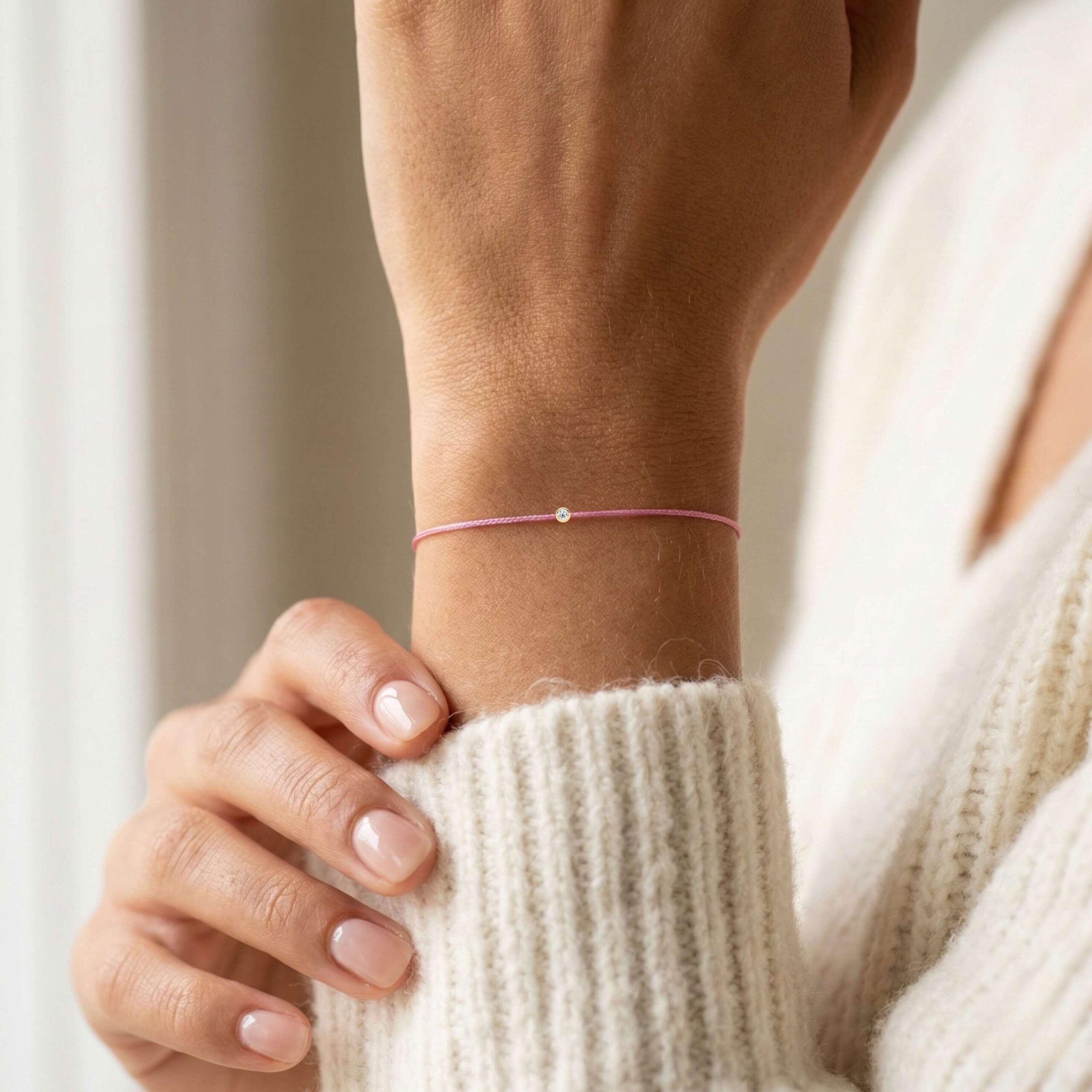 See roosa või muu niidiga käevõru teemantidega on valmistatud kvaliteetsest niidist, naturaalsest teemandist ja 14k 585 kullast.