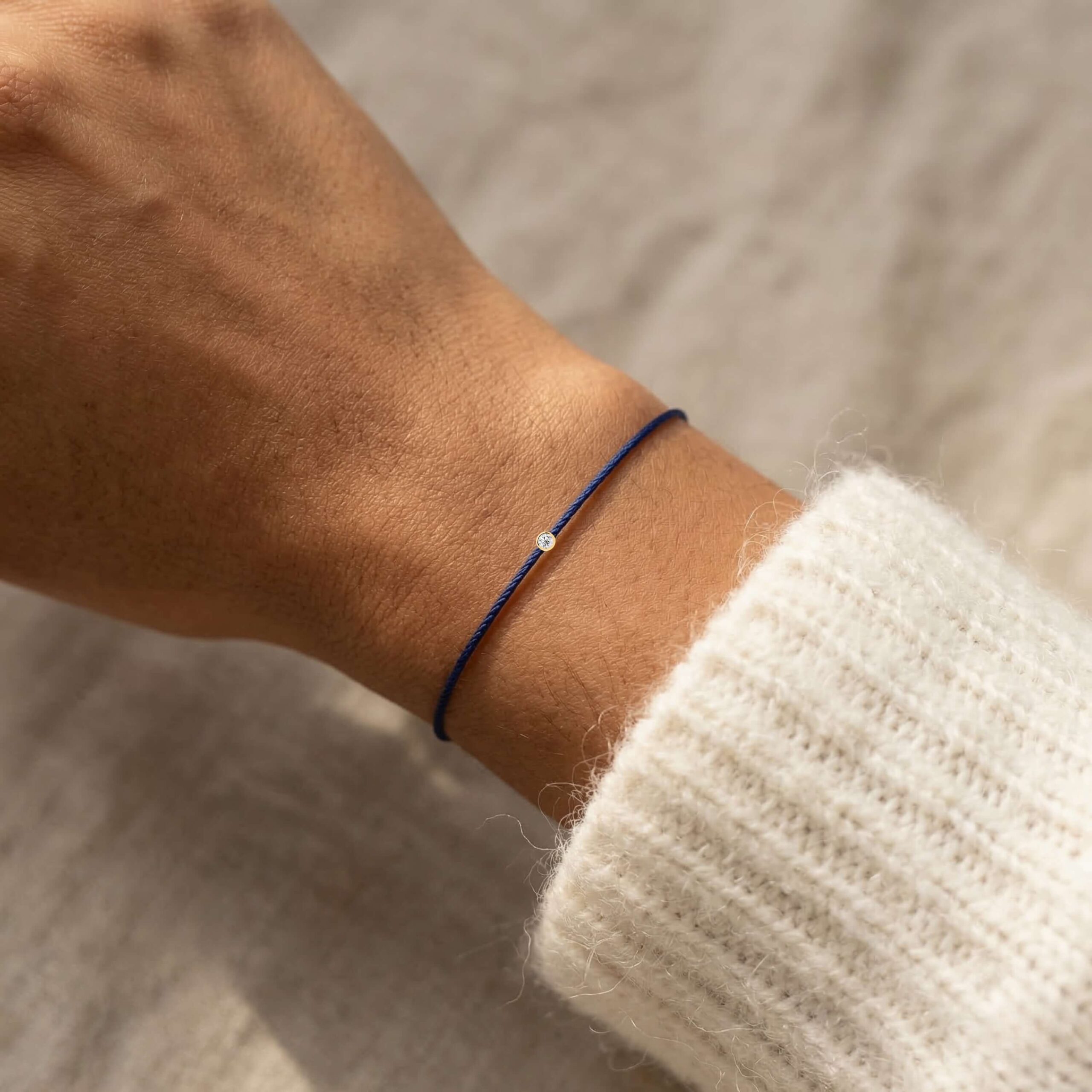 See sinine või muust niidist käevõru teemantidega on valmistatud kvaliteetsest niidist, naturaalsest teemandist ja 14k 585 kullast.