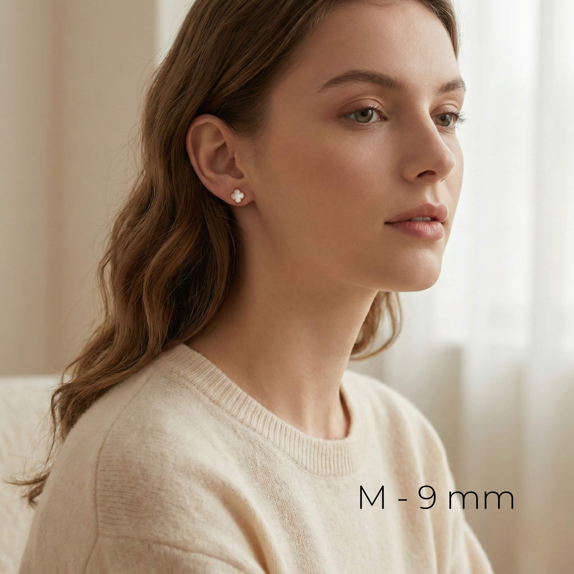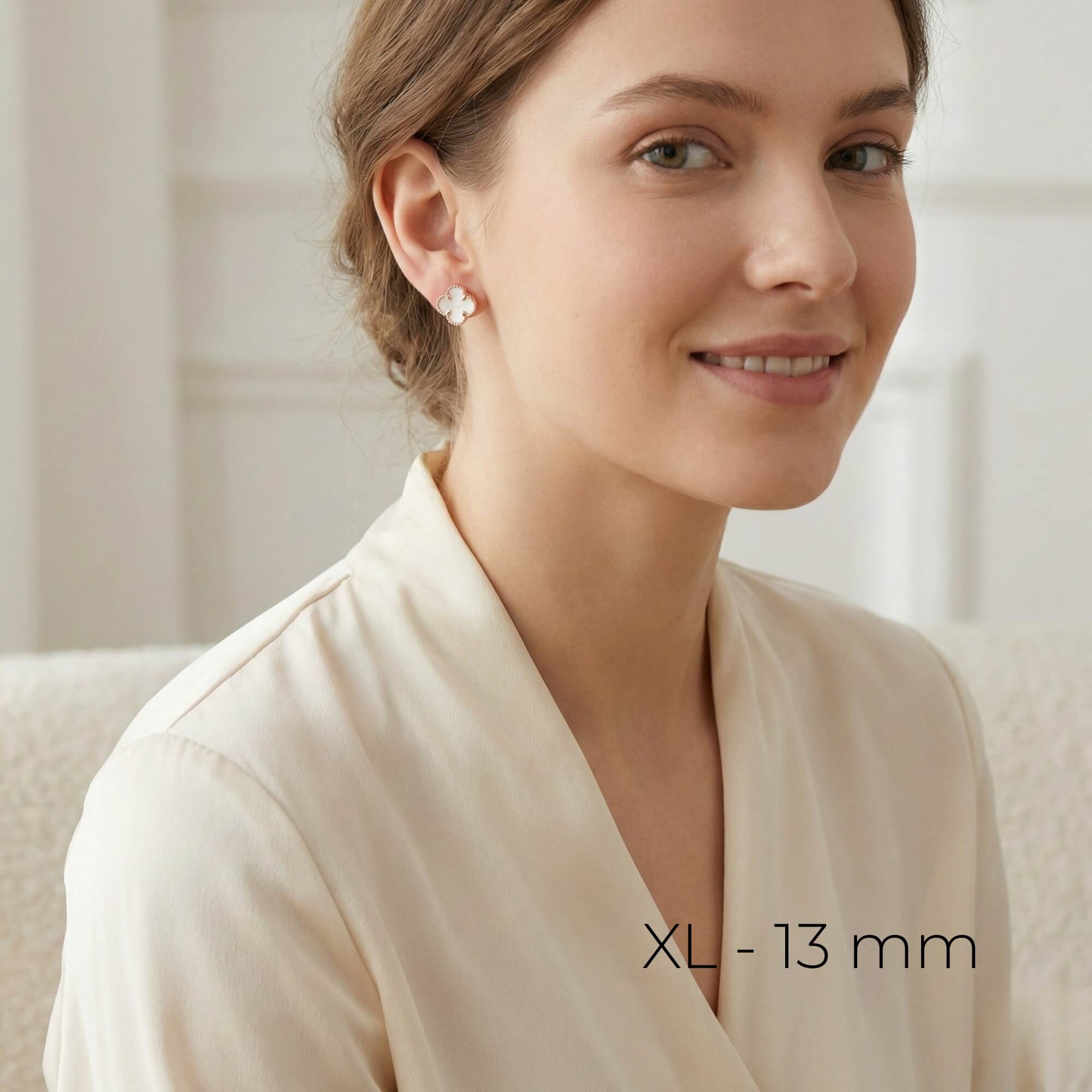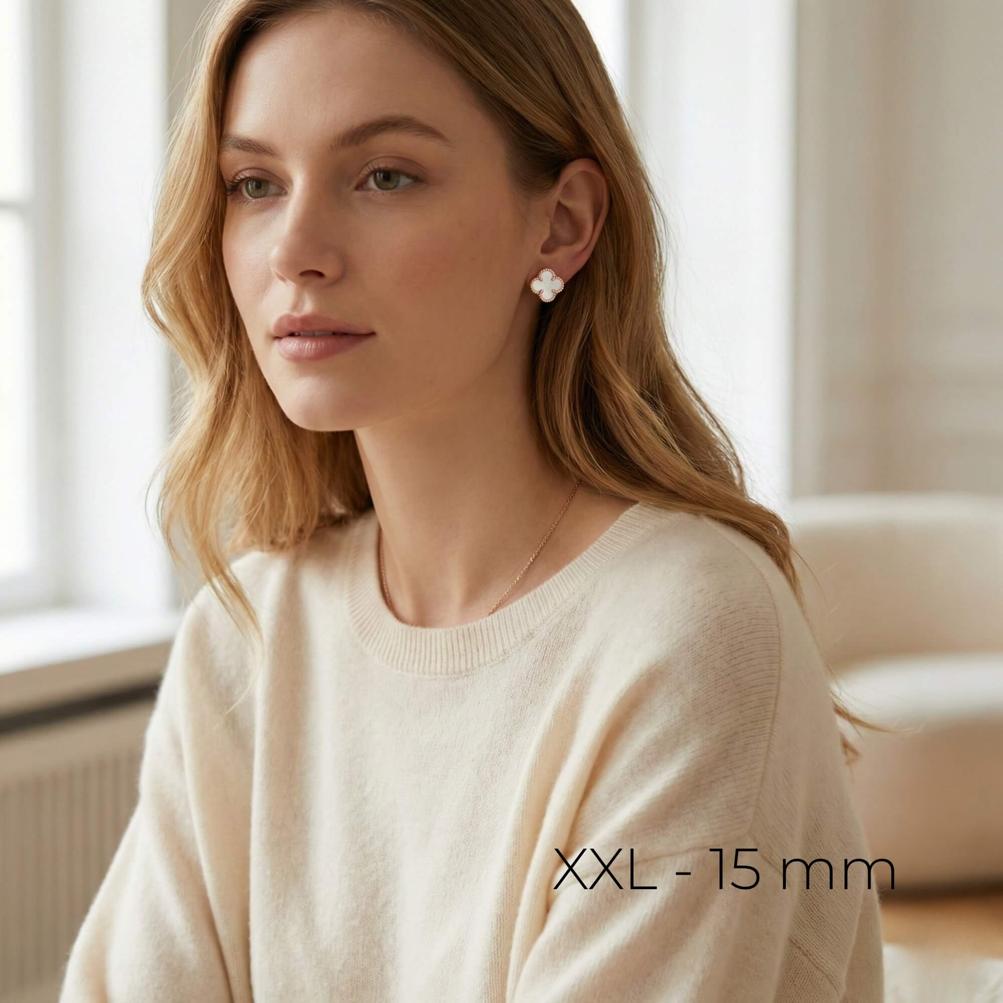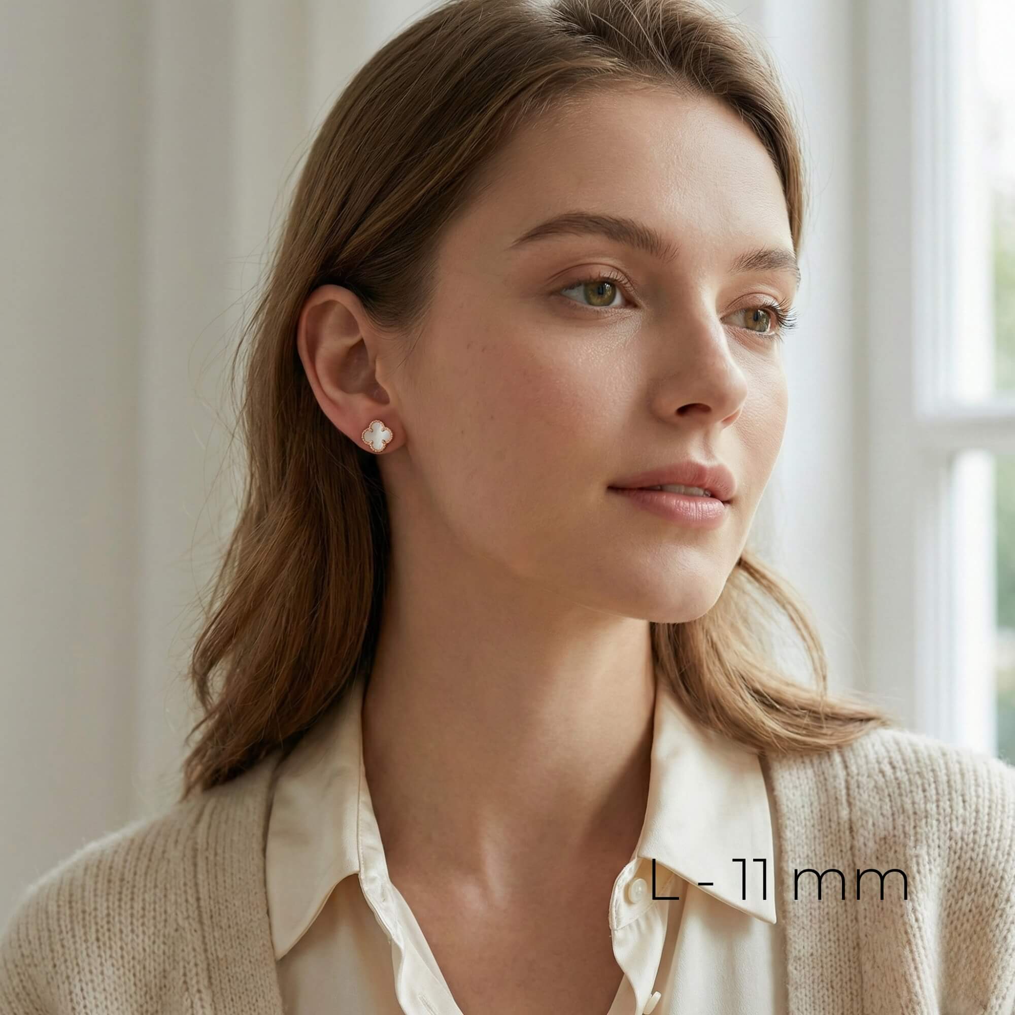 Te eleganckie koniczynki złote kolczyki dla kobiet wykonane są z prawdziwego złota próby 585 i naturalnego kamienia masy perłowej. Te złote kolczyki wyróżniają się delikatnym wzornictwem i luksusem, a biała masa perłowa nadaje im ekskluzywności i wyrafinowania. Kolczyki mają wygodne zapięcie typu haczyk, które zapewnia, że będą się mocno trzymać i idealnie nadają się do codziennego noszenia lub na specjalne okazje.