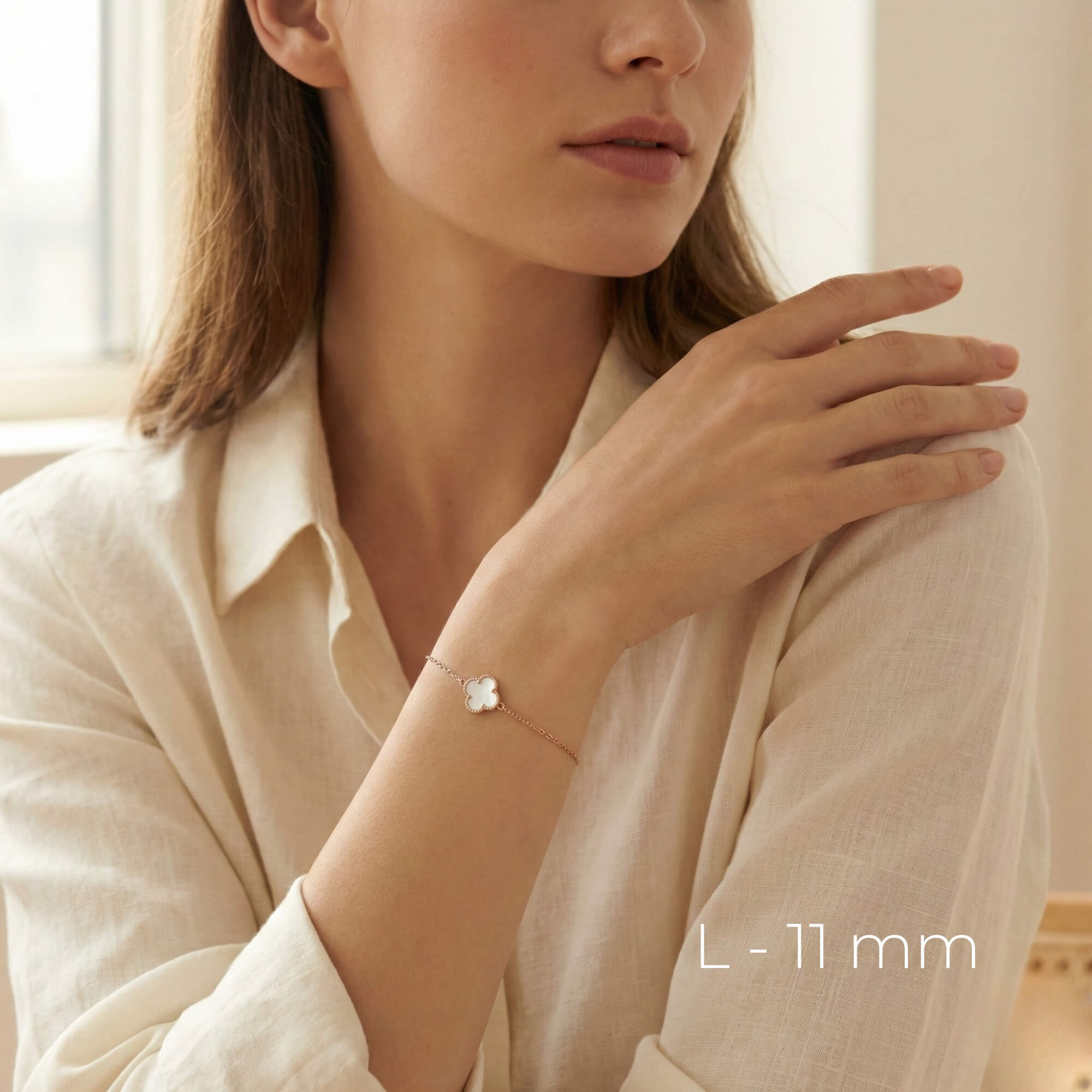 Этот элегантный экземпляр в форме клевера золотой браслет изготовлен из настоящего золота 585 пробы и натурального перламутра. Этот золотой браслет выделяется своим тонким дизайном и роскошью, а белый перламутр добавляет эксклюзивности и изысканности.